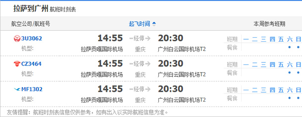 拉薩飛廣州的直達(dá)航班有3個(gè),航班號(hào)有南方航空CZ3464、東方航空MU3279、廈門航空MF1306,詳細(xì)的直達(dá)航班時(shí)刻表如下圖所示: