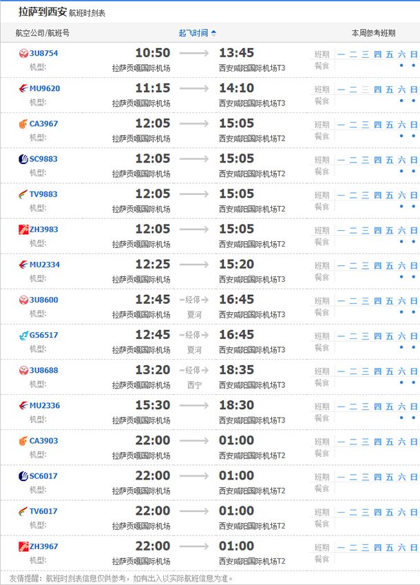 以上就是拉薩飛西安的航班時刻表,起飛時間,到達(dá)時間,及固定航班日期。>>相關(guān)閱讀:西安到拉薩飛機航班時刻表